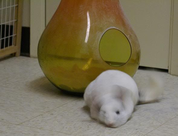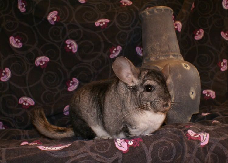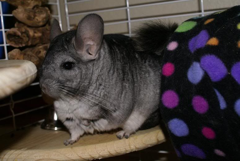 I stepped in and bought her instead, (very politely mind you) thus causing a large about of scowls and murmurs and finger pointing, general loathing, etc in my direction. Whatever, I saved her life. I'm never going back to that show locatuion. I don't know if I'll go to another chin show for awhile.. It was really an unpleasant experience.. Most everyone was really rude and full of crap, and well.. I won't go on about it anymore.. There are a couple nice breeders I've met so far out here.. I'll leave it at that. Ah, and you should hear the poor little creatures scream when they're groomed by the long razor-sharp nail brushes.. It's horribly sad.. being held upside-down by the end of your tail, or an ear perhaps, and having needles raked through your skin.. It was such a sad sound.. Mika still grumbles and chirps sometimes when I gently groom her with a dog grooming comb, --firmly grip base of tail while chin is sitting on your leg, push comb straight down, tilt till perpendicular with skin, and then bring comb up-repeat... loooong process, but it's not torturous.. She generally enjoys it ^^
